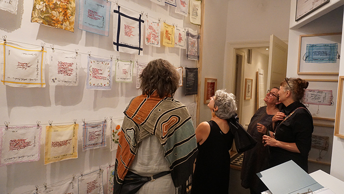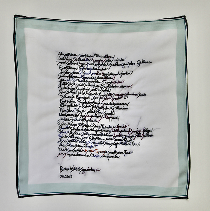eigene lyrik von hand gestickt auf stofftaschentücher verschiedenster provenienz