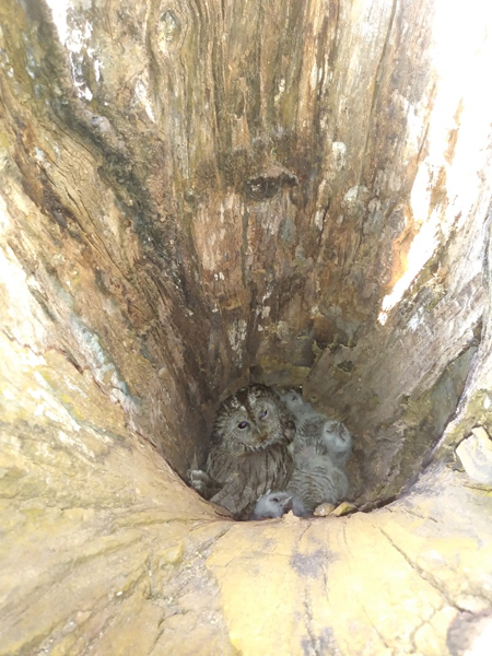 den dringenden Bettelrufen nach zu schließen, wie sie aus dem hohlen Apfelbaum ertönen, sind die Käuzchenjungen zwar bereits geschlüpft und also sogenannte Nestlinge: als Ästlinge aber wird man sie vermutlich nur in der Dämmerung oder nachts heraußen sehen (wohl unter mütterlichem Schutz), allerdings scheint kauzbezüglich generell vom Beobachtungspunkt aus absolute Bewegungslosigkeit des Lauernden notwendig zu sein und man fragt sich sowieso, mit welch überscharfen Sinnen diese Nachträuber selbst ihre notwendige Beute (Mäuse, Maulwürfe etc.) von ihrer Warte herab ausfindig machen und dann im lautlosen Anflug erhaschen können